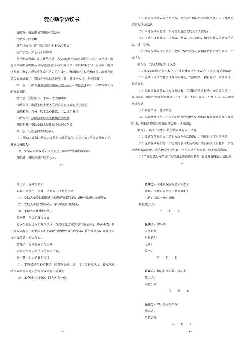 善舉創(chuàng)造和諧,愛心傳承美德。為弘揚(yáng)新時(shí)代扶貧幫困的人道主義精神,南通市保安服務(wù)有限公司發(fā)動(dòng)廣大黨員職工,定向資助如東縣茗海中學(xué)初三(9)班繆宇林同學(xué)。該同學(xué)母親離異,父親于今年1月因車禍搶救無效不幸生亡,奶奶肢體二級(jí)殘疾常年臥床不起,公司黨總支幫助她解決學(xué)習(xí)和生活中的困難。4月14日下午,公司黨總支副書記錢大年帶領(lǐng)相關(guān)部門負(fù)責(zé)人來到如東縣茗海中學(xué),舉行了捐資助學(xué)儀式,在副校長(zhǎng)周軍和洋口鎮(zhèn)三江口村黨總支書記張慧劍的見證下,將公司黨員職工的愛心捐款交到了繆宇琳同學(xué)手中,希望她珍惜當(dāng)前學(xué)習(xí)條件和機(jī)會(huì),發(fā)奮努力、刻苦學(xué)習(xí),做一個(gè)品學(xué)兼優(yōu)的好學(xué)生,公司將繼續(xù)資助其完成高中階段學(xué)業(yè)。